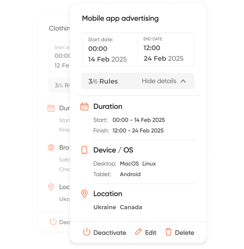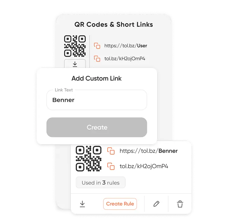 TOL supports intelligent redirects based on device type or operating system, browser, traffic source, interface language (locale), and user location. Each click is processed with these parameters in mind to ensure users land on the most relevant version of a page or app.
